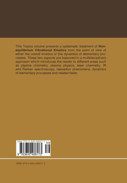 1. Introduction.- 1.1 Nonequilibrium Versus Equilibrium Vibrational Kinetics.- 1.2 Organization of This Book.- 2. Vibrational Kinetics, Dissociation, and Ionization of Diatomic Molecules Under Nonequilibrium Conditions.- 2.1 Laser-Induced Vibrational Kinetics.- 2.2 Nonequilibrium Vibrational Kinetics Under Electrical Discharges.- 2.3 Post-Discharge Conditions.- 2.4 Summary.- References.- 3. Analytical Theory of Vibrational Kinetics of Anharmonic Oscillators.- 3.1 Historical Overview.- 3.2 Rate Equations and Probabilities of Elementary Processes.- 3.3 V-T Relaxation in an Inert Gas.- 3.4 Treanor Distribution in the V-V Exchange.- 3.5 V-V and V-T Exchange. Weak Excitation Regime.- 3.6 Resonance V-V Relaxation Under High-Excitation Conditions. Steady-State Conditions.- 3.7 Relaxation at Moderate Excitation of Vibrations.- 3.8 Non-Steady-State Relaxation Regime at High Excitation.- 3.9 Vibrational Kinetics and Chemical Reactions Involving Vibrational1y Excited Molecules.- 3.10 Laser Emission Excitation of Molecular Vibrations.- 3.11 Vibrational Relaxation Under Adiabatic Expansion in the Supersonic Nozzle.- 3.12 Further Studies and Outlook.- References.- 4. Vibration-Vibration and Vibration-Translation Energy Transfer, Including Multiquantum Transitions in Atom-Diatom and Diatom-Diatom Collisions.- 4.1 First-Order Theories.- 4.2 Scaling Theories.- 4.3 Semiclassical Theories.- 4.4 Analytical Expressions for V-V and V-T Rate Constants.- 4.5 Energy Transfer in Specific Systems.- 4.A Appendix: Tables of Energy Transfer Rates in the H2 + H2, N2 + N2, He + CO, and CO + CO Systems.- References.- 5. Vibrational Energy Transfer in Collisions Involving Free Radicals.- 5.1 Mechanisms for Vibrational Relaxation.- 5.2 Experimental Results and Discussion.- 5.3 Conclusion and Prognosis.-References.- 6. Dynamics of Reactions Involving Vibrationally Excited Molecules.- 6.1 Experimental and Computational Results for Representative Atom-Diatom Reactions.- 6.2 Theoretical Outlook.- 6.3 Conclusions.- References.- 7. Vibrational Excitation and Dissociative Attachment.- 7.1 The Resonance Model.- 7.2 Applications to Specific Molecules.- 7.3 Applications of the Attachment Process Under Nonequilibrium Conditions.- 7.A Appendix: Normalization of Continuum Functions.- References.- 8. Vibrational Distribution and Rate Constants for Vibrational Energy Transfer.- 8.1 Vibrational Distribution.- 8.2 Rate Constants for Vibrational Energy Transfer.- References.- 9. Isotope Separation by Vibration-Vibration Pumping.- 9.1 Kinetic Modeling.- 9.2 Experimental Studies.- 9.3 V-V Pumping as an Alternative Method of Stable Isotope Preparation.- References.- 10. Vibrational Kinetics and Reactions of Polyatomic Molecules in Nonequilibrium Systems.- 10.1 Elementary Process of V-T Relaxation of Highly Excited Polyatomic Molecules.- 10.2 Elementary Process of V-V Exchange of Highly Excited Polyatomic Molecules.- 10.3 Population of Vibrationally Excited States of Polyatomic Molecules in Nonequilibrium Conditions.- 10.4 Reactions of Polyatomic Molecules Under Essentially Nonequilibrium Conditions.- 10.5 CO2 Dissociation Stimulated by Vibrational Excitation of Molecules in Plasma.- 10.6 Summary.- References.- 11. Coupling of Vibrational and Electronic Energy Distributions in Discharge and Post-Discharge Conditions.- 11.1 Coupling Between NV and the Free-Electron Energy Distribution Function.- 11.2 Coupling Between NV and NV*.- 11.3 Conclusions.- References.- Additional References with Titles.