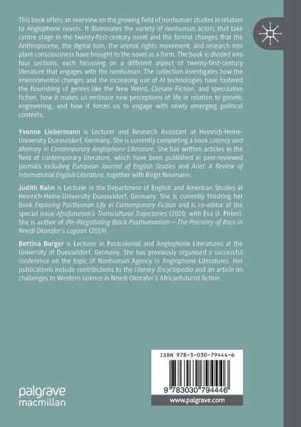 This book offers an overview on the growing field of nonhuman studies in relation to Anglophone novels. It illuminates the variety of nonhuman actors that take centre stage in the twenty-first-century novel and the formal changes that the Anthropocene, the digital turn, the animal rights movement, and research into plant consciousness have brought to the novel as a form. The book is divided into four sections, each focusing on a different aspect of twenty-first-century literature that engages with the nonhuman. The collection investigates how the environmental changes and the increasing use of AI technologies have fostered the flourishing of genres like the New Weird, Climate Fiction, and speculative fiction, how it makes us embrace new perceptions of life in relation to genetic engineering, and how it forces us to engage with newly emerging political contexts.