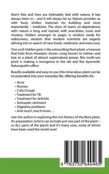 Man's fate and lives are intimately tied with nature, it has always been so - and it will always be so. Nature provides us with food, shelter, materials for building and most importantly - medicine. The story of man's co-dependence with nature is long and myriad, with anecdotes, cures and mystery. Hidden amongst its pages is wisdom ready for rediscovery, wisdom that modern scientists are eagerly delving into in search of new foods, medicines and even cure.One such hidden gem is the astounding Noni plant, a treasure that hails from Hawaiian shores. Long known to natives and lore as a plant of almost supernatural power, this multi-use plant is making a resurgence in the lab and the Ayurvedic Naturopath's office. Readily available and easy to use, this miraculous plant can be incorporated into your everyday life, offering benefits for:_ Acne_ Nausea_ Colic/Cough_ Treatment for TB_ Treatment for Arthritis_ Antiseptic ointment_ Digestive problems_ And much, much more...Join the authorin exploring the rich history of the Noni plant, it's preparation (which can include just one part of the plant - or all parts of the plant) and it's many uses, some of which have been used the world over!