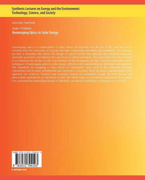 Nonimaging optics is a subdiscipline of optics whose development over the last 35-40 years was led by scientists from the University of Chicago and other cooperating individuals and institutions. The approach provides a formalism that allows the design of optical devices that approach the maximum physically attainable geometric concentration for a given set of optical tolerances. This means that it has the potential to revolutionize the design of solar concentrators. In this monograph, the basic practical applications of the techniques of nonimaging optics to solar energy collection and…mehr