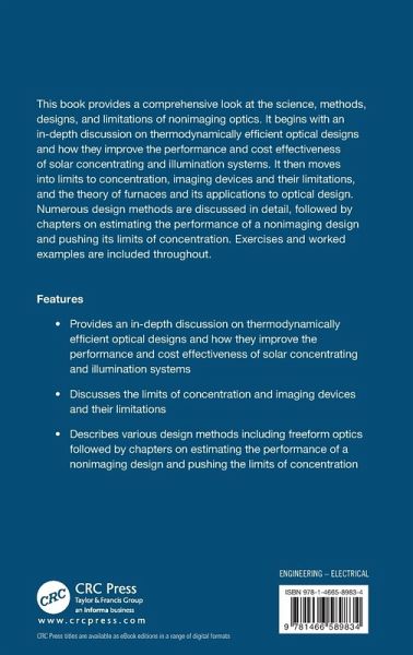 This book provides a comprehensive look at the science, methods, designs, and limitations of nonimaging optics. It begins with an in-depth discussion on thermodynamically efficient optical designs and how they improve the performance and cost effectiveness of solar concentrating and illumination systems.