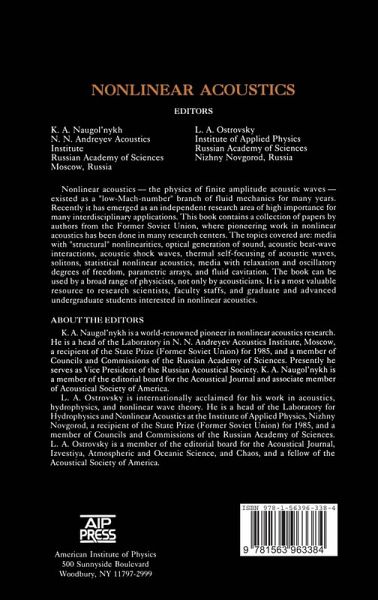 Market: Acousticians, research scientists, instructors, and graduate and advanced undergraduate students in nonlinear acoustics. This book contains a collection of papers by authors of the Former Soviet Union. The topics covered are media with "structural" nonlinearities, optical generation of sound, acoustic beat-wave interactions, acoustic shock waves, thermal self-focusing of acoustic waves, solitons, statistical nonlinear acoustics, media with relaxation and oscillatory degrees of freedom, parametric arrays, and fluid cavitation.
