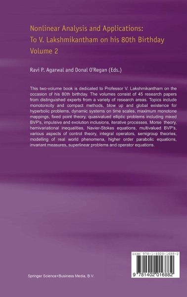 Nonlinear Analysis and Applications is dedicated to Professor V. Lakshmikantham on the occasion of his 80th birthday. The volumes consist of 45 research papers from distinguished experts from a variety of research areas. Topics include monotonicity and compact methods, blow up and global existence for hyperbolic problems, dynamic systems on time scales, maximum monotone mappings, fixed point theory, quasivalued elliptic problems including mixed BVP's, impulsive and evolution inclusions, iterative processes, Morse theory, hemivariational inequalities, Navier-Stokes equations, multivalued BVP's, various aspects of control theory, integral operators, semigroup theories, modelling of real world phenomena, higher order parabolic equations, invariant measures, superlinear problems and operator equations.