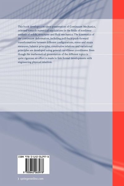 This book develops a modern presentation of Continuum Mechanics, oriented towards numerical applications in the fields of nonlinear analysis of solids, structures and fluid mechanics. The kinematics of the continuum deformation, including pull-back / push-forward transformations between different configurations, stress and strain measures, balance principles, constitutive relations and variational principles are developed using general curvilinear coordinates. Even though the mathematical presentation of the different topics is quite rigorous, an effort is made to link formal developments with engineering physical intuition.