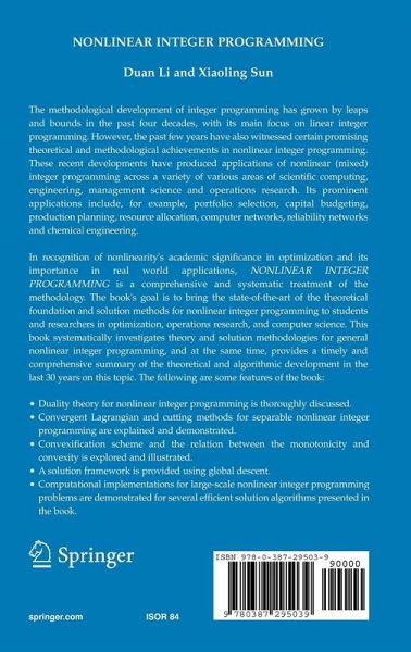 From the reviews: "This book addresses the topic of the general nonlinear integer programming (NLIP). The overall goal of the book is to bring the state of the art of the theoretical foundations and solution methods of NLIP to readers who are interested in optimization, operations research and computer science. This book investigates the theory and solution methodologies for the general NLIP and provides the developments of the last 30 years. It is assumed that readers are familiar with linear integer programming and the book thus focuses on the theory and solution methodologies of NLIP. The following are some of the features of the book: \roster \item"$\bullet$" Duality theory for NLIP: Investigation into the relationship of the duality gap and the perturbation function has lead to the development of nonlinear Lagrangian theory, thus establishing a methodology for the solution of the NLIP. \item"$\bullet$" Convergent Lagrangian and cutting plane methods for NLIP: Concepts like the objective level cuts, objective contour cuts or the domain cut reshapes the perturbation function. This leads to the optimal solution to lie in the convex hull of the perturbation functions and thus guarantees a zero duality gap. \item"$\bullet$" Convexification scheme: Using the connection between monotonicity and convexity, convexification schemes are developed for monotone and non-convex integer programs, thus extending the reach of branch and bound methods. \item"$\bullet$" Solution framework using global descent: The optimal solution of an NLIP is sought from among the local minima. A theoretical framework is also established to escape from a local minimum. \item"$\bullet$" Computational implications for NLIP: Several NLIPs with up to several thousand variables are solved by solution algorithms presented in this book." (Romesh Saigal, Mathematical Reviews) "The book's goal is to bring the state-of-the-art NIP theoretical foundation and solution methods to students and researchers in optimization, OR, and computer science. ... I think this is an interesting book about NIP and related issues. Many students, professionals, professors, and researchers could use it to learn key concepts about this topic. Therefore, I consider this work a valuable reference for graduate students or researchers interested in integer programming in a wide sense ... ." (Javier Faulin, Interfaces, Vol. 37 (4), 2007) "The goal of the book is to bring the state-of-the-art of the theoretical foundation and solution methods for nonlinear integer programming to readers who are interested in optimization, operations research and computer science. ... Readers of this book can be researchers, practitioners, graduate students and senior undergraduate students ... . It can be also used as a reference book for researchers, engineers and practitioners to solve real-world application problems by nonlinear integer programming models." (Oleg A. Shcherbina, Zentralblatt MATH, Vol. 1140, 2008)