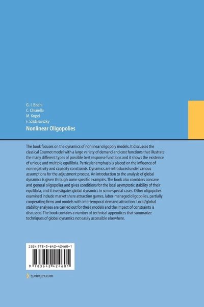 The book focuses on the dynamics of nonlinear oligopoly models. It discusses the classical Cournot model with a large variety of demand and cost functions that illustrate the many different types of possible best response functions and it shows the existence of unique and multiple equilibria. Particular emphasis is placed on the influence of nonnegativity and capacity constraints. Dynamics are introduced under various assumptions for the adjustment process. An introduction to the analysis of global dynamics is given through some specific examples. The book also considers concave and general oligopolies and gives conditions for the local asymptotic stability of their equilibria, and it investigates global dynamics in some special cases. Other oligopolies examined include market share attraction games, labor-managed oligopolies, partially cooperating firms and models with intertemporal demand attraction. Local/global stability analyses are carried out for these models and the impact of constraints is discussed. The book contains a number of technical appendices that summarize techniques of global dynamics not easily accessible elsewhere.