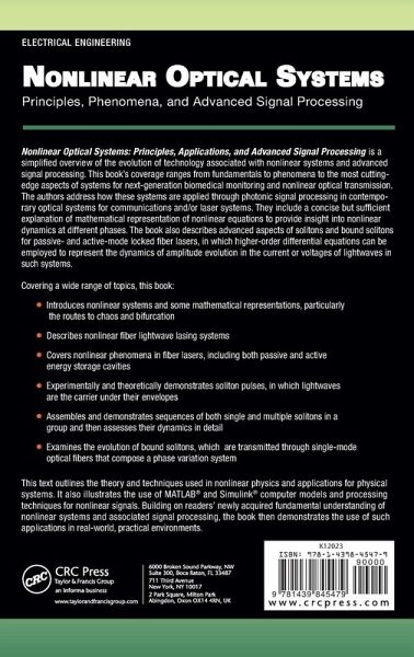 Nonlinear Optical Systems: Principles, Phenomena, and Advanced Signal Processing is a simplified overview of the evolution of technology associated with nonlinear systems and advanced signal processing. This book's coverage ranges from fundamentals to phenomena to the most cutting-edge aspects of systems for next-generation biomedical monitoring and nonlinear optical transmission. The authors address how these systems are applied through photonic signal processing in contemporary optical systems for communications and/or laser systems. They include a concise but sufficient explanation of mathematical representation of nonlinear equations to provide insight into nonlinear dynamics at different phases. The book also describes advanced aspects of solitons and bound solitons for passive- and active-mode locked fiber lasers, in which higher-order differential equations can be employed to represent the dynamics of amplitude evolution in the current or voltages of lightwaves in such systems. Covering a wide range of topics, this book: Introduces nonlinear systems and some mathematical representations, particularly the routes to chaos and bifurcation Describes nonlinear fiber lightwave lasing systems Covers nonlinear phenomena in fiber lasers, including both passive and active energy storage cavities Experimentally and theoretically demonstrates soliton pulses, in which lightwaves are the carrier under their envelopes Assembles and demonstrates sequences of both single and multiple solitons in a group and then assesses their dynamics in detail Examines the evolution of bound solitons, which are transmitted through single-mode optical fibers that compose a phase variation system This text outlines the theory and techniques used in nonlinear physics and applications for physical systems. It also illustrates the use of MATLAB® and Simulink® computer models and processing techniques for nonlinear signals. Building on readers' newly acquired fundamental understanding of nonlinear systems and associated signal processing, the book then demonstrates the use of such applications in real-world, practical environments.