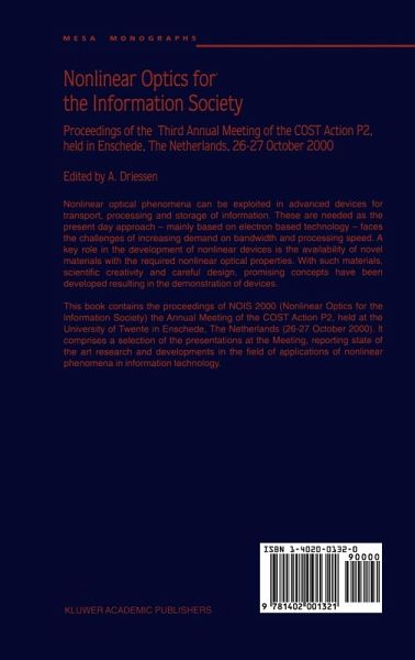 Nonlinear optical phenomena can be exploited in advanced devices for transport, processing, and storage of information. These are needed as the present-day approach - mainly using on electron-based technology - faces the challenges of increasing demand on bandwidth and processing speed. A key role in the development of nonlinear devices is the availability of novel materials with the required nonlinear optical properties. With such materials, scientific creativity and careful design, promising concepts have been developed resulting in the demonstration of devices. This book contains the proceedings of NOIS 2000 (Nonlinear Optics for the Information Society) Annual Meeting of the COST Action P2, held at the University of Twente, in Enschede, The Netherlands, on 26-27 October, 2000. It comprises a selection of the presentations at the meeting, reporting state-of-the-art research and developments in the field of applications of nonlinear phenomena in information technology.