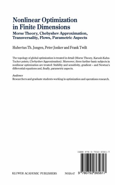 At the heart of the topology of global optimization lies Morse Theory: The study of the behaviour of lower level sets of functions as the level varies. Roughly speaking, the topology of lower level sets only may change when passing a level which corresponds to a stationary point (or Karush-Kuhn Tucker point). We study elements of Morse Theory, both in the unconstrained and constrained case. Special attention is paid to the degree of differentiabil ity of the functions under consideration. The reader will become motivated to discuss the possible shapes and forms of functions that may possibly arise within a given problem framework. In a separate chapter we show how certain ideas may be carried over to nonsmooth items, such as problems of Chebyshev approximation type. We made this choice in order to show that a good under standing of regular smooth problems may lead to a straightforward treatment of "just" continuous problems by means of suitable perturbation techniques, taking a priori nonsmoothness into account. Moreover, we make a focal point analysis in order to emphasize the difference between inner product norms and, for example, the maximum norm. Then, specific tools from algebraic topol ogy, in particular homology theory, are treated in some detail. However, this development is carried out only as far as it is needed to understand the relation between critical points of a function on a manifold with structured boundary. Then, we pay attention to three important subjects in nonlinear optimization.