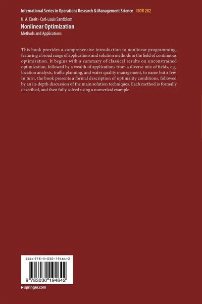 This book provides a comprehensive introduction to nonlinear programming, featuring a broad range of applications and solution methods in the field of continuous optimization. It begins with a summary of classical results on unconstrained optimization, followed by a wealth of applications from a diverse mix of fields, e.g. location analysis, traffic planning, and water quality management, to name but a few. In turn, the book presents a formal description of optimality conditions, followed by an in-depth discussion of the main solution techniques. Each method is formally described, and then fully solved using a numerical example.