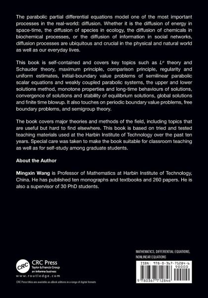 The parabolic partial differential equations model one of the most important processes in the real-world: diffusion. Whether it is the diffusion of energy in space-time, the diffusion of species in ecology, the diffusion of chemicals in biochemical processes, or the diffusion of information in social networks, diffusion processes are ubiquitous and crucial in the physical and natural world as well as our everyday lives. This book is self-contained and covers key topics such as the Lp theory and Schauder theory, maximum principle, comparison principle, regularity and uniform estimates, initial-boundary value problems of semilinear parabolic scalar equations and weakly coupled parabolic systems, the upper and lower solutions method, monotone properties and long-time behaviours of solutions, convergence of solutions and stability of equilibrium solutions, global solutions and finite time blowup. It also touches on periodic boundary value problems, free boundary problems, and semigroup theory. The book covers major theories and methods of the field, including topics that are useful but hard to find elsewhere. This book is based on tried and tested teaching materials used at the Harbin Institute of Technology over the past ten years. Special care was taken to make the book suitable for classroom teaching as well as for self-study among graduate students. About the Author: Mingxin Wang is Professor of Mathematics at Harbin Institute of Technology, China. He has published ten monographs and textbooks and 260 papers. He is also a supervisor of 30 PhD students.