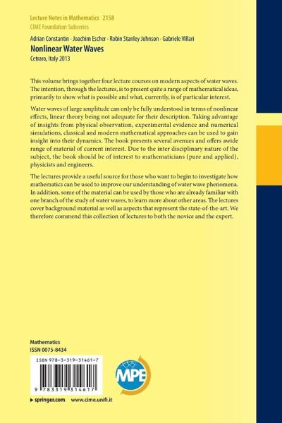 Thelectures provide a useful source for those who want to begin to investigate howmathematics can be used to improve our understanding of water wave phenomena.In addition, some of the material can be used by those who are already familiarwith one branch of the study of waterwaves, to learn more about other areas.