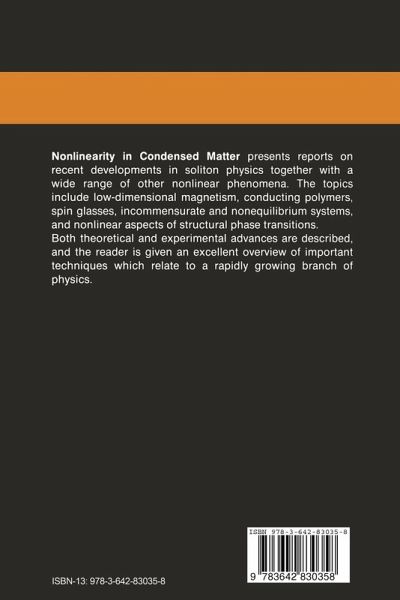 The Sixth Annual Conference of the Center for Nonlinear Studies at the Los Alamos National Laboratory was held May 5-9, 1986, on the topic "Nonlinearity in Condensed Matter: Lessons from the Past and Prospects for the Future. " As conference organizers, we felt that the study of non linear phenomena in condensed matter had matured to the point where it made sense to take stock of the numerous lessons to be learned from a variety of contexts where nonlinearity plays a fundamental role and to evaluate the prospects for the growth of this general discipline. The successful 1978 Oxford Symposium on nonlinear (soliton) struc ture and dynamics in condensed matter (Springer Ser. Solid-State Sci. , Vol. 8) was held at a time when the ubiquity of solitons was just begin ning to be appreciated by the condensed matter community; in subsequent years the soliton paradigm has provided a rather useful framework for in vestigating a large number of phenomena, particularly in low-dimensional systems. Nevertheless, we felt that the importance of nonlinearity in wider arenas than "solitonics" merited a significant expansion in the scope of the conference over that of the 1978 symposium. Indeed, many of the lessons are quite general and their potential for cross-fertilization of otherwise poorly connected disciplines was certainly one of the prime motivations for this conference. Thus, while these proceedings contain many contribu tions pertaining to soliton behavior in different contexts, the reader will find much more as well, particularly in the later chapters.