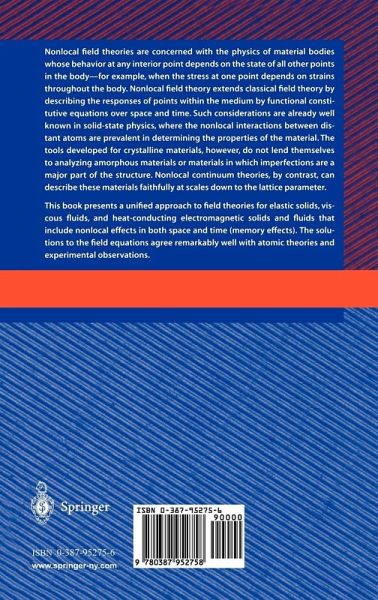 Nonlocal continuum field theories are concerned with material bodies whose behavior at any interior point depends on the state of all other points in the body - rather than only on an effective field resulting from these points - in addition to its own state and the state of some calculable external field. Nonlocal field theory extends classical field theory by describing the responses of points within the medium by functionals rather than functions (the "constitutive relations" of classical field theory). Such considerations are already well known in solid-state physics, where the nonlocal interactions between the atoms are prevalent in determining the properties of the material. The tools developed for crystalline materials, however, do not lend themselves to analyzing amorphous materials, or materials in which imperfections are a major part of the structure. Nonlocal continuum theories, by contrast, can describe these materials faithfully at scales down to the lattice param eter. This book presents a unified approach to field theories for elastic solids, viscous fluids, and heat-conducting electromagnetic solids and fluids that include nonlocal effects in both space and time (memory effects). The solutions to the field equations agree remarkably well with atomic theories and experimental observations.