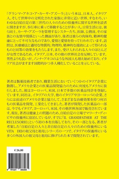 IL libro "NONNA AKIKO A CASA AZZURRA" apre al lettore un mondo molto vicino alle famiglie Giapponesi, Italiane e di tutto il mondo civile e cioè quello relativo alle Case di Riposo per persone della terza età cosiddette AUTOSUFFICENTI, ma che spesso per muoversi hanno bisogno di un carrello deambulatore. Sono presenti aspetti della vita quotidiana, delle loro amicizie e relazioni tra loro e con le Suore che gestiscono Casa Azzurra, oltre che con i medici, gli operatori civili e i propri famigliari , quest'ultimi fondamentali per la loro salute fisica e mentale che con l'affetto e le visite hanno l'effetto paragonabile a quello ottenuto con le terapie mediche e con una buona assistenza materiale, fisica e spirituale. Riflette inoltre la società Italiana, Giapponese e di altre nazioni del mondo, perché le persone ospitate sono per la maggior parte donne, che vivono più a lungo degli uomini, ma iniziano ad essere presenti anche stranieri come Nonna AKIKO, segno che la società italiana è sempre più internazionale e multirazziale.