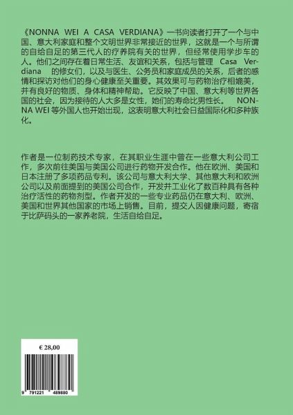 IL libro " NONNA WEI A CASA VERDIANA" apre al lettore un mondo molto vicino alle famiglie Cinesi,Italiane e di tutto il mondo civile e cioè quello relativo alle Case di Riposo per persone della terza età cosiddette AUTOSUFFICENTI, ma che spesso per muoversi utlizzano un carrello deambulatore. Sono presenti aspetti della vita quotidiana, delle amicizie e relazioni tra loro, con le Suore che gestiscono Casa Verdiana, oltre che con i medici, gli operatori civili e i famigliari, quest'ultimi fondamentali per la loro salute fisica e mentale con il loro affetto e le loro visite, che hanno l'effetto paragonabile a quello ottenuto con le terapie mediche e con una buona assistenza materiale, fisica e spirituale. Riflette la società Cinese, Italiana e di altre nazioni del mondo, perché le persone ospitate sono per la maggior parte donne, che vivono più a lungo degli uomini. Iniziano ad essere presenti anche stranieri come NONNA WEI, segno che la società italiana è sempre più internazionale e multirazziale.