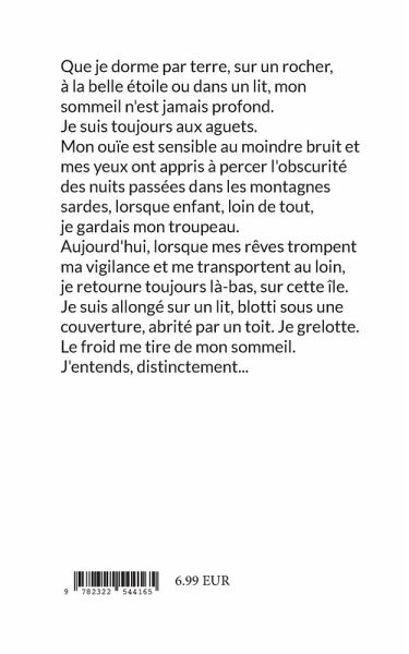 Que je dorme par terre, sur un rocher, à la belle étoile ou dans un lit, mon sommeil n'est jamais profond. Je suis toujours aux aguets. Mon ouïe est sensible au moindre bruit et mes yeux ont appris à percer l'obscurité des nuits passées dans les montagnes sardes, lorsque enfant, loin de tout, je gardais mon troupeau. Aujourd'hui, lorsque mes rêves trompent ma vigilance et me transportent au loin, je retourne toujours là-bas, sur cette île. Je suis allongé sur un lit, blotti sous une couverture, abrité par un toit. Je grelotte. Le froid me tire de mon sommeil. J'entends, distinctement...