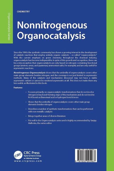 Since the 1990s the synthetic community has shown a growing interest in the development of catalytic reactions that employ entirely organic catalysts - so-called 'organocatalysts'. With the current emphasis on green chemistry throughout the chemical industry, organocatalysis has become indispensible. In spite of this growth and recognition, there can be a misconception that organocatalysts are only based on nitrogen-containing functional groups (amines, ureas, and quaternary ammonium salts, for example), and are only useful for asymmetric reactions. Nonnitrogenous Organocatalysis shows that the umbrella of organocatalysis covers other main group elements besides nitrogen, and the coverage is not just limited to asymmetric methods. Many of the catalysts and mechanisms discussed may not have a viable asymmetric variant or cannot be rendered asymmetric at all. This does not make them any less useful, as illustrated in this book.