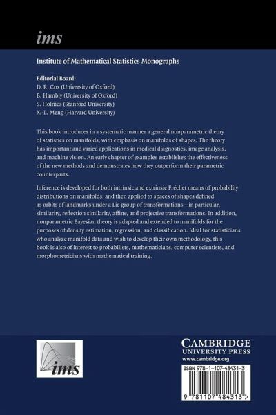 This book introduces in a systematic manner a general nonparametric theory of statistics on manifolds, with emphasis on manifolds of shapes. The theory has important and varied applications in medical diagnostics, image analysis, and machine vision. An early chapter of examples establishes the effectiveness of the new methods and demonstrates how they outperform their parametric counterparts. Inference is developed for both intrinsic and extrinsic Fréchet means of probability distributions on manifolds, then applied to shape spaces defined as orbits of landmarks under a Lie group of transformations - in particular, similarity, reflection similarity, affine and projective transformations. In addition, nonparametric Bayesian theory is adapted and extended to manifolds for the purposes of density estimation, regression and classification. Ideal for statisticians who analyze manifold data and wish to develop their own methodology, this book is also of interest to probabilists, mathematicians, computer scientists, and morphometricians with mathematical training.