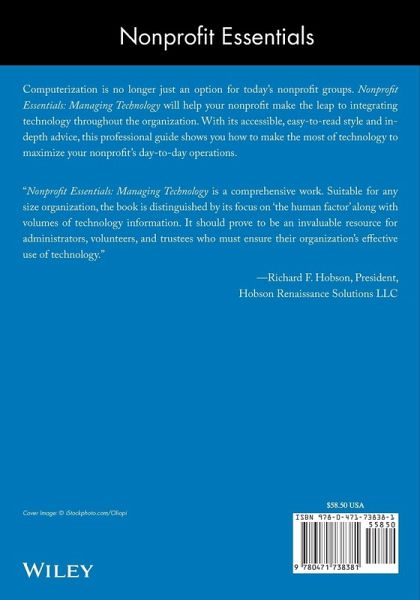 "Nonprofit Essentials: Managing Technology is a comprehensive work. Suitable for any size organization, the book is distinguished by its focus on 'the human factor' along with volumes of technology information. It should prove to be an invaluable resource for administrators, volunteers, and trustees who must ensure their organization's effective use of technology." --Richard F. Hobson, President Hobson Renaissance Solutions LLC