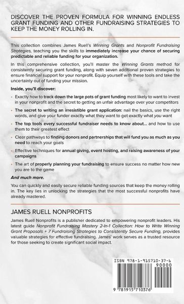 Successful fundraising is your nonprofit's key to success. Discover the proven formula for winning endless grant funding and other fundraising strategies to keep the money rolling in. Holes in the funding plan are the biggest reason most nonprofits fail within the first few years of operation. Everywhere, nonprofit leaders spend sleepless nights worrying about securing the necessary funds to continue their mission. Without proper funding, even the most passionate and well-intended efforts can falter, leaving community needs unmet. But that's not going to be you. Running a nonprofit to serve the community is a noble and rewarding task, but its success hinges on securing the necessary funding. Enter Nonprofit Fundraising Mastery 2-in-1 Collection. This collection combines James Ruell's Winning Grants and Nonprofit Fundraising Strategies, teaching you the skills to immediately increase your chance of securing predictable and reliable funding for your organization. In this comprehensive collection, you'll master the Winning Grants method for consistently securing grant funding, along with seven additional proven strategies to ensure financial support for your nonprofit. Equip yourself with these tools and take the uncertainty out of funding your mission. Inside, you'll discover: Exactly how to track down the large pots of grant funding most likely to want to invest in your nonprofit and the secret to getting an unfair advantage over your competitors Why your relationship with your funder absolutely mustn't stop after you've completed your application The secret to writing an irresistible grant application: nail the basics, use the right words, and give your funder exactly what they want, to get exactly what you want The biggest reasons grant proposals get rejected... and how to avoid making the same mistakes The top tools every successful fundraiser needs to know about... and how to use them to their greatest effect 7 practical and super effective strategies for fundraising, with clear steps to success Clear pathways to finding donors and partnerships that will fund you as much as you need to reach your goals How to harness the power of the internet and the rich world of social media to your advantage Effective techniques for annual giving, event hosting, and raising awareness of your campaigns The art of properly planning your fundraising to ensure success no matter how new you are to the game And much more. Perhaps you've crafted countless grant proposals, each one feeling more like a roll of the dice than a sure thing, and your reservoir of fundraising ideas is nearing exhaustion... But don't lose heart; hope is on the horizon. You can quickly and easily secure reliable funding sources and keep that money rolling in. The key lies in unlocking the strategies that the most successful nonprofits have already mastered. And you're just one click away from making it happen. Discover the secret to writing winning proposals and becoming a successful fundraiser: Scroll up, and click the 'add to cart' button right now.