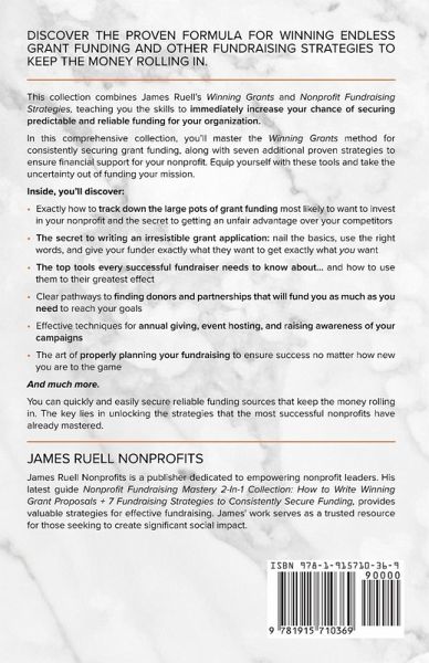 Successful fundraising is your nonprofit's key to success. Discover the proven formula for winning endless grant funding and other fundraising strategies to keep the money rolling in. Holes in the funding plan are the biggest reason most nonprofits fail within the first few years of operation. Everywhere, nonprofit leaders spend sleepless nights worrying about securing the necessary funds to continue their mission. Without proper funding, even the most passionate and well-intended efforts can falter, leaving community needs unmet. But that's not going to be you. Running a nonprofit to serve the community is a noble and rewarding task, but its success hinges on securing the necessary funding. Enter Nonprofit Fundraising Mastery 2-in-1 Collection. This collection combines James Ruell's Winning Grants and Nonprofit Fundraising Strategies, teaching you the skills to immediately increase your chance of securing predictable and reliable funding for your organization. In this comprehensive collection, you'll master the Winning Grants method for consistently securing grant funding, along with seven additional proven strategies to ensure financial support for your nonprofit. Equip yourself with these tools and take the uncertainty out of funding your mission. Inside, you'll discover: Exactly how to track down the large pots of grant funding most likely to want to invest in your nonprofit and the secret to getting an unfair advantage over your competitors Why your relationship with your funder absolutely mustn't stop after you've completed your application The secret to writing an irresistible grant application: nail the basics, use the right words, and give your funder exactly what they want, to get exactly what you want The biggest reasons grant proposals get rejected... and how to avoid making the same mistakes The top tools every successful fundraiser needs to know about... and how to use them to their greatest effect 7 practical and super effective strategies for fundraising, with clear steps to success Clear pathways to finding donors and partnerships that will fund you as much as you need to reach your goals How to harness the power of the internet and the rich world of social media to your advantage Effective techniques for annual giving, event hosting, and raising awareness of your campaigns The art of properly planning your fundraising to ensure success no matter how new you are to the game And much more. Perhaps you've crafted countless grant proposals, each one feeling more like a roll of the dice than a sure thing, and your reservoir of fundraising ideas is nearing exhaustion... But don't lose heart; hope is on the horizon. You can quickly and easily secure reliable funding sources and keep that money rolling in. The key lies in unlocking the strategies that the most successful nonprofits have already mastered. And you're just one click away from making it happen. Discover the secret to writing winning proposals and becoming a successful fundraiser: Scroll up, and click the 'add to cart' button right now.