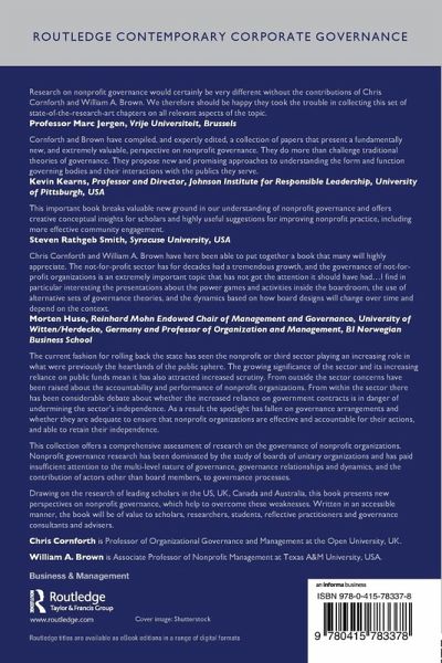 'Cornforth and Brown have compiled, and expertly edited, a collection of papers that present a fundamentally new, and extremely valuable, perspective on nonprofit governance. They do more than challenge traditional theories of governance. They propose new and promising approaches to understanding the form and function governing bodies and their interactions with the publics they serve.'