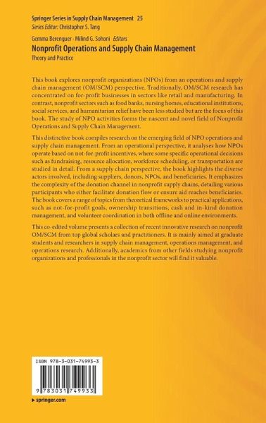 This distinctive book compiles research on the emerging field of NPO operations and supply chain management. From an operational perspective, it analyses how NPOs operate based on not-for-profit incentives, where some specific operational decisions such as fundraising, resource allocation, workforce scheduling, or transportation are studied in detail. From a supply chain perspective, the book highlights the diverse actors involved, includingsuppliers, donors, NPOs, and beneficiaries. It emphasizes the complexity of the donation channel in nonprofit supply chains, detailing various participants who either facilitate donation flow or ensure aid reaches beneficiaries. The book covers a range of topics from theoretical frameworks to practical applications, such as not-for-profit goals, ownership transitions, cash and in-kind donation management, and volunteer coordination in both offline and online environments.