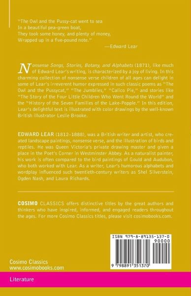 "The Owl and the Pussy-cat went to sea In a beautiful pea-green boat, They took some honey, and plenty of money, Wrapped up in a five-pound note." -Edward Lear Nonsense Songs, Stories, Botany, and Alphabets (1871), like much of Edward Lear's writing, is characterized by a joy of living. In this charming collection of nonsense verse children of all ages can delight in some of Lear's irreverent humor expressed in such classic poems as "The Owl and the Pussycat," "The Jumblies," "Calico Pie," and stories like "The Story of the Four Little Children Who Went Round the World" and the "History of the Seven Families of the Lake-Popple." In this edition, Lear's delightful text is illustrated with color drawings by the well-known British illustrator Leslie Brooke.