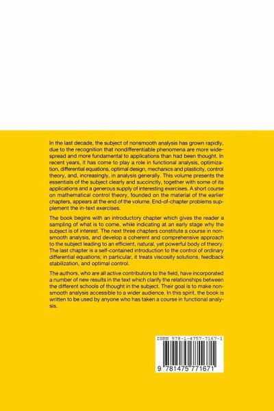 In the last decades the subject of nonsmooth analysis has grown rapidly due to the recognition that nondifferentiable phenomena are more widespread, and play a more important role, than had been thought. In recent years, it has come to play a role in functional analysis, optimization, optimal design, mechanics and plasticity, differential equations, control theory, and, increasingly, in analysis. This volume presents the essentials of the subject clearly and succinctly, together with some of its applications and a generous supply of interesting exercises. The book begins with an introductory chapter which gives the reader a sampling of what is to come while indicating at an early stage why the subject is of interest. The next three chapters constitute a course in nonsmooth analysis and identify a coherent and comprehensive approach to the subject leading to an efficient, natural, yet powerful body of theory. The last chapter, as its name implies, is a self-contained introduction to thetheory of control of ordinary differential equations. End-of-chapter problems also offer scope for deeper understanding. The authors have incorporated in the text a number of new results which clarify the relationships between the different schools of thought in the subject. Their goal is to make nonsmooth analysis accessible to a wider audience. In this spirit, the book is written so as to be used by anyone who has taken a course in functional analysis.