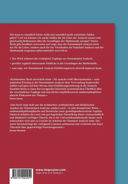 "Das Buch zeigt nicht nur die technischen, methodischen und didaktischen Aspekte der Nonstandard-Analysis, sondern auch - in sehr kompetenter Weise - mathematikphilosophische und historische sowie grundlagentheoretische Aspekte. Dadurch erhalten die Leser eine gut begründete Darstellung dieser wissenschaftlich und didaktisch wichtigen Theorie, die in der Universitätsmathematik immer noch unterschätzt wird und zu Unrecht im Schatten der Standard-Analysis steht. Der Autor berücksichtigt die vorliegende Literatur umfassend und vermittelt eine klare Übersicht über gegenwärtige Forschungstrends." Roman Murawski