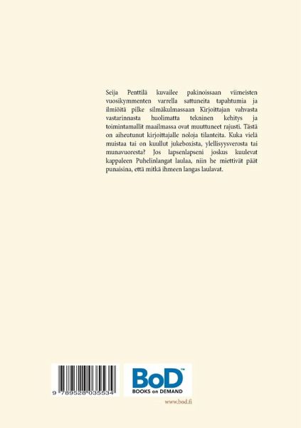 Seija Penttilä kuvailee pakinoissaan viimeisten vuosikymmenten varrella sattuneita tapahtumia ja ilmiöitä pilke silmäkulmassaan. Kirjoittajan vahvasta vastarinnasta huolimatta tekninen kehitys ja toimintamallit maailmassa ovat muuttuneet rajusti. Tästä on aiheutunut kirjoittajalle noloja tilanteita. Kuka vielä muistaa tai on kuullut jukeboxista, ylellisyysverosta tai munavuoresta? Jos lapsenlapseni joskus kuulevat kappaleen Puhelinlangat laulaa, niin he miettivät päät punaisina, että mitkä ihmeen langat laulavat.