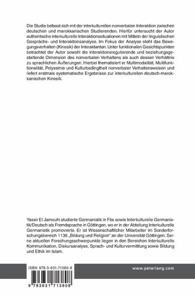 Die Studie befasst sich mit der interkulturellen nonverbalen Interaktion zwischen deutschen und marokkanischen Studierenden. Hierfür untersucht der Autor authentische interkulturelle Interaktionssituationen mit Mitteln der linguistischen Gesprächs- und Interaktionsanalyse. Im Fokus der Analyse steht das Bewegungsverhalten (Kinesik) der Interaktanten. Unter funktionalen Gesichtspunkten betrachtet der Autor sowohl die interaktionsregulierende und beziehungsgestaltende Dimension des nonverbalen Verhaltens als auch dessen Verhältnis zu sprachlichen Äußerungen. Hierbei thematisiert er Multimodalität, Multifunktionalität, Polysemie und Kulturbedingtheit nonverbaler Verhaltensweisen und liefert erstmals systematische Ergebnisse zur interkulturellen deutsch-marokkanischen Kinesik.