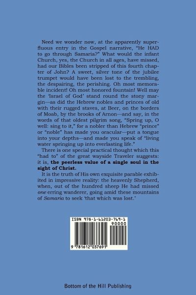 Need we wonder now, at the apparently superfluous entry in the Gospel narrative, "He HAD to go through Samaria?" What would the infant Church, yes, the Church in all ages, have missed, had our Bibles been stripped of this fourth chapter of John? A sweet, silver tone of the jubilee trumpet would have been lost to the trembling, the despairing, the perishing. Oh most memorable incident! Oh most honored fountain! Well may the 'Israel of God' stand round the stony margin-as did the Hebrew nobles and princes of old with their rugged staves, at Beer, on the borders of Moab, by the brooks of Arnon-and say, in the words of that oldest pilgrim song, "Spring up, O well: sing to it," for a nobler than Hebrew "prince" or "noble" has made you oracular-put a tongue into your depths-and made you speak of "living water springing up into everlasting life." There is one special practical thought which this "had to" of the great wayside Traveler suggests: it is, the peerless value of a single soul in the sight of Christ. It is the truth of His own exquisite parable exhibited in impressive reality: the heavenly Shepherd, when, out of the hundred sheep He had missed one erring wanderer, going amid these mountains of Samaria to seek 'that which was lost.'