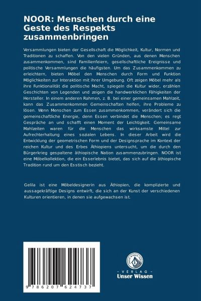Versammlungen bieten der Gesellschaft die Möglichkeit, Kultur, Normen und Traditionen zu schaffen. Von den vielen Gründen, aus denen Menschen zusammenkommen, sind Familienfeiern, gesellschaftliche Ereignisse und politische Versammlungen die häufigsten. Um das Zusammenkommen zu erleichtern, bieten Möbel den Menschen durch Form und Funktion Möglichkeiten zur Interaktion mit ihrer Umgebung. Oft zeigen Möbel mehr als ihre Funktionalität die politische Macht, spiegeln die Kultur wider, erzählen Geschichten von Legenden und zeigen die handwerklichen Fähigkeiten der Hersteller. In einem anderen Rahmen, z. B. bei einer gemeinsamen Mahlzeit, kann das Zusammenkommen Gemeinschaften helfen, ihre Probleme zu lösen. Wenn Menschen zum Essen zusammenkommen, verändert sich die gemeinschaftliche Energie, denn Essen verbindet die Menschen; es regt Gespräche an und schafft einen Moment der Leichtigkeit. Gemeinsame Mahlzeiten waren für die Menschen das wirksamste Mittel zur Aufrechterhaltung eines sozialen Lebens. In dieser Arbeit wird die Entwicklung der geometrischen Form und der Designsprache im Kontext der reichen Kultur und des Erbes Äthiopiens untersucht, um die durch den Bürgerkrieg gespaltene äthiopische Nation zusammenzubringen. NOOR ist eine Möbelkollektion, die ein Esserlebnis bietet, das sich auf die äthiopische Tradition rund um den Esstisch bezieht.