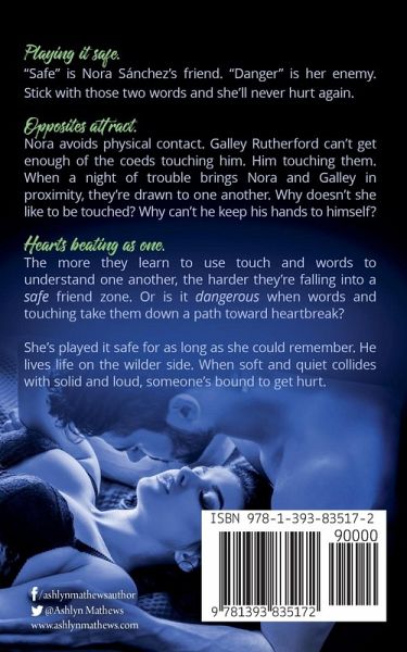 Playing it safe "Safe" is Nora Sánchez's friend. "Danger" is her enemy. Stick with those two words and she'll never hurt again. Opposites attract Nora avoids physical contact. Galley Rutherford can't get enough of the coeds touching him. Him touching them. When a night of trouble brings Nora and Galley in proximity, they're drawn to one another. Why doesn't she like to be touched? Why can't he keep his hands to himself? Hearts beating as one The more they learn to use touch and words to understand one another, the harder they're falling into a safe friend zone. Or is it dangerous when words and touching take them down a path toward heartbreak? She's played it safe for as long as she could remember. He lives life on the wilder side. When soft and quiet collides with solid and loud, someone's bound to get hurt. Author note: Galley "filthy-mouthed" Rutherford is THE KING of f-bombs. But he's filthy hot, too. Read at your own risk.
