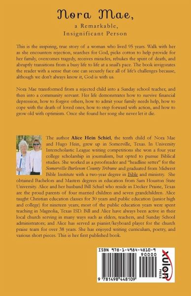 This is the inspiring, true story of a woman who lived 95 years. Walk with her as she encounters rejection, searches for God, picks cotton to help provide for her family, overcomes tragedy, receives miracles, rebukes the spirit of death, and abruptly transitions from a busy life to life at a snail's pace. The book invigorates the reader with a sense that one can securely face all of life's challenges because, although we don't always know it, God is with us. Nora Mae transformed from a rejected child into a Sunday School teacher, and then into a community servant. Her life demonstrates how to survive financial depression, how to forgive others, how to admit your family needs help, how to cope with the death of loved ones, how to step forward with action, and how to grow old with optimism. Once she found her song she never let it die.