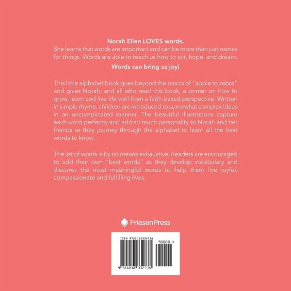 Norah Ellen LOVES words. She learns that words are important and can be more than just names for things. Words are able to teach us how to act, hope, and dream. Words can bring us joy! This little alphabet book goes beyond the basics of "apple to zebra" and gives Norah, and all who read this book, a primer on how to grow, learn and live life well from a faith-based perspective. Written in simple rhyme, children are introduced to somewhat complex ideas in an uncomplicated manner. The beautiful illustrations capture each word perfectly and add so much personality to Norah and her friends as they journey through the alphabet to learn all the best words to know. The list of words is by no means exhaustive. Readers are encouraged to add their own "best words" as they develop vocabulary and discover the most meaningful words to help them live joyful, compassionate and fulfilling lives.