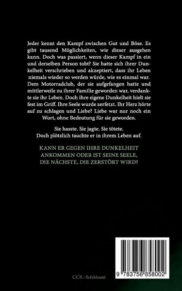 Jeder kennt den Kampf zwischen Gut und Böse. Es gibt tausend Möglichkeiten, wie dieser ausgehen kann.Doch was passiert, wenn dieser Kampf in ein und derselben Person tobt?Sie hatte sich ihrer Dunkelheit verschrieben und akzeptiert, dass ihr Leben niemals wieder so werden würde, wie es einmal war.Dem Motorradclub, der sie aufgefangen hatte und mittlerweile zu ihrer Familie geworden war, verdankte sie ihr Leben.Doch ihre eigene Dunkelheit hielt sie fest im Griff.Ihre Seele wurde zerfetzt. Ihr Herz hörte auf zu schlagen und Liebe?Liebe war nur noch ein Wort, ohne Bedeutung für sie geworden.Sie hasste. Sie jagte. Sie tötete.Doch plötzlich tauchte er in ihrem Leben auf.Kann er gegen ihre Dunkelheit ankommen oder ist seine Seele, die Nächste, die zerstört wird?