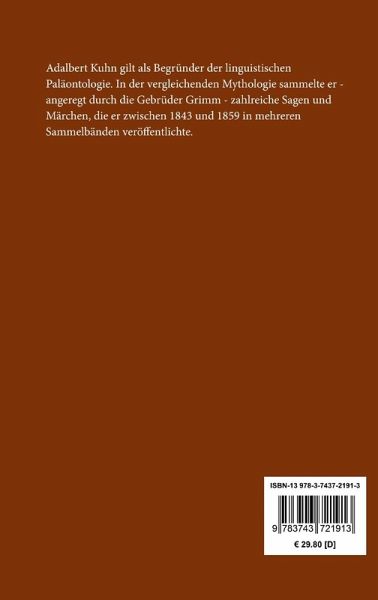 Adalbert Kuhn gilt als Begründer der linguistischen Paläontologie. In der vergleichenden Mythologie sammelte er - angeregt durch die Gebrüder Grimm - zahlreiche Sagen und Märchen, die er zwischen 1843 und 1859 in mehreren Sammelbänden veröffentlichte.