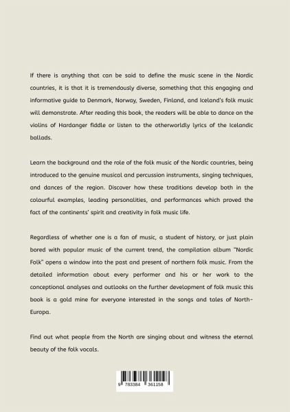 If there is anything that can be said to define the music scene in the Nordic countries, it is that it is tremendously diverse, something that this engaging and informative guide to Denmark, Norway, Sweden, Finland, and Iceland's folk music will demonstrate. After reading this book, the readers will be able to dance on the violins of Hardanger fiddle or listen to the otherworldly lyrics of the Icelandic ballads. Learn the background and the role of the folk music of the Nordic countries, being introduced to the genuine musical and percussion instruments, singing techniques, and dances of the region. Discover how these traditions develop both in the colourful examples, leading personalities, and performances which proved the fact of the continents' spirit and creativity in folk music life. Regardless of whether one is a fan of music, a student of history, or just plain bored with popular music of the current trend, the compilation album "Nordic Folk" opens a window into the past and present of northern folk music. From the detailed information about every performer and his or her work to the conceptional analyses and outlooks on the further development of folk music this book is a gold mine for everyone interested in the songs and tales of North-Europa. Find out what people from the North are singing about and witness the eternal beauty of the folk vocals.