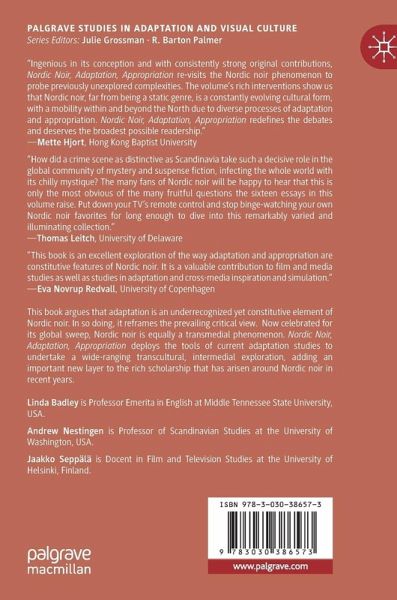 Section I, Center/Periphery.- Chapter 01, Appropriations of Nordic locations: Shetland and Ø - Gunhild Agger.- Chapter 02, Arctic Noir on Screen: Midnight Sun (2016-) as a Mix of Geopolitical Criticism and Spectacular, Mythical Landscapes - Anne Marit Waade.- Chapter 03, Arctic Noir: Revitalizing Sámi Culture through Film Noir - Gunnar Iversen.- Chapter 04, Law of the Land Balancing Between Noir and Western - Kaisa Hiltunen.- Chapter 05, Revisiting the Crime Scene: Intermedial Translation, Adaptation and Novelisation of The Killing - Jakob Stougaard-Nielsen.- Chapter 06, Paratextual Adaptations of Nordic Noir - Pietari Kaapa.- Section II, Similarity/Difference.- Chapter 07, The Postman Rings Yet Again. Or: The Appropriation of James M. Cain in Norway - Audun Engelstad.- Chapter 08, Nordic Noir: The Broad Picture - Luis M. García-Mainar.- Chapter 09, Traces of the (in)visible: David Lagercrantz' Novel The Girl in the Spider's Web as Filmic Text - Maaret Koskinen.- Chapter 10, After Wallander? Adapting Nordic Noir Success into a Viable Audio-Visual Industry in Southern Sweden - Olof Hedling.- Chapter 11, "Remakes as Rebots: Äkta Människor, Humans, and the Uncanny Valley" - Mark B. Sandberg.- Section III, Narration and Style.- Chapter 12, The Style of Nordic Noir: Exploring Bordertown as a Stylistic Adaptation of Prototypical Nordic noirs - Jaakko Seppälä.- Chapter 13, From Nordic Noir to Euronoir: Nordic Noir Influencing European Serial Drama - Kim Toft Hansen.- Chapter 14, Viking Noir - Björn Nordfjörd.- Chapter 15, Nordic Noir Remade in Hollywood: The Killing and The Bridge Revisited - Lynge Stegger Gemzøe.