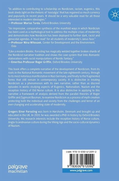 This book offers a complete narrative of the development of Nordicism, from its roots in the National Romantic movement of the late eighteenth century, through to its most notorious manifestation in Nazi Germany, and finally to the fragmented forms that still remain in contemporary society. It is distinctive in treating Nordicism as a phenomenon with its own narrative, rather than as discreet episodes in works studying aspects of Eugenics, Nationalism, Nazism and the reception history of Old Norse culture. It is also distinctive in applying to this narrative a framework of analysis derived from the parallel theories of Roger Griffin and Zygmunt Bauman, to examine Nordicism as a process of myth creation protecting both the individual and society from the challenges and terror of an ever-changing and accelerating state of modernity.