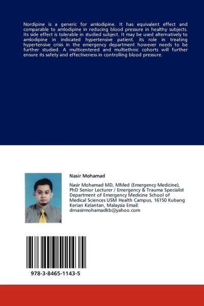 Nordipine is a generic for amlodipine. It has equivalent effect and comparable to amlodipine in reducing blood pressure in healthy subjects. Its side effect is tolerable in studied subject. It may be used alternatively to amlodipine in indicated hypertensive patient. its role in treating hypertensive crisis in the emergency department however needs to be further studied. A multicentered and multiethnic cohorts will further ensure its safety and effectiveness in controlling blood pressure.