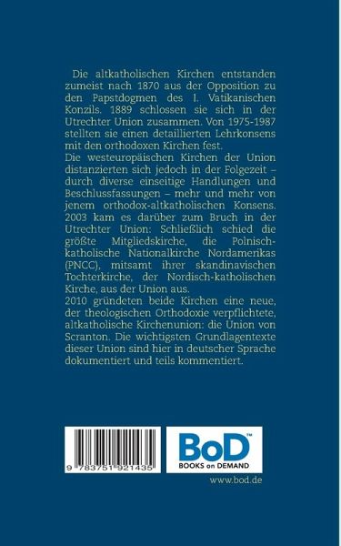 Die altkatholischen Kirchen entstanden zumeist nach 1870 aus der Opposition zu den Papstdogmen (Jurisdiktionsprimat und Unfehlbarkeit) des Ersten Vatikanischen Konzils. Vom selbständigen römisch-katholischen Erzbistum Utrecht erhielten diese Kirchen ihre apostolische Sukzession und bildeten mit diesem 1889 die Utrechter Union, auf der Grundlage der sogenannten Utrechter Erklärung. Von Anfang an existierten Fliehkräfte in der Union angesichts widerstrebender theologischer Profile, die sich auch in unterschiedlichen ökumenischen Prioritäten äußerten. Ende des 20. Jahrhundert kam es zur Zerreißprobe: Im Gegensatz zu Nordamerika und Osteuropa entwickelte sich in den altkatholischen Kirchen Westeuropas eine immer größere Offenheit gegenüber liberalen Strömungen im Anglikanismus und Protestantismus und zugleich eine sehr distanzierte Haltung gegenüber dem 1975-1987 erarbeiteten orthodox-altkatholischen Lehrkonsens. Publikumswirksamen Ausdruck fand diese neue theologische Bewegung in der vehementen Forderung insbesondere im deutschsprachigen Altkatholizismus, auch ohne klares Mandat in Schrift und Tradition und ohne innerkirchlichen, geschweige denn ökumenischen Konsens (z.B. mit der römisch-katholischen oder orthodoxen Kirche) Frauen zum Priesteramt zu ordinieren. 1996 kam es, zuerst in Deutschland, denn auch zur einseitigen Umsetzung dieser Forderung; die zwingende Folge war eine Aussetzung der sakramentalen Gemeinschaft zwischen nordamerikanischen und deutschen Altkatholiken.2003 schließlich kam es zum endgültigen Bruch in der Utrechter Union der altkatholischen Kirchen: Die größte Mitgliedskirche, die Polnisch-katholische Nationalkirche Nordamerikas (PNCC) schied mitsamt ihrer 1999/2000 gegründeten skandinavischen Tochterkirche, der Nordisch-katholischen Kirche, aus der Utrechter Union aus. Gemeinsam gründeten diese beiden Kirchen eine neue altkatholische Kirchenunion, welche an der tradierten altkatholischen Lehre und dem orthodox altkatholischen Lehrkonsens festhält: die Union von Scranton.Der vorliegende Band versammelt nun (teilweise erstmals in deutscher Übersetzung): die Lehrgrundlagen der Union von Scranton (mit Ausnahme des umfangreichen orthodox-altkatholischen Konsensdokuments), ihre wichtigsten kirchenrechtlichen Texte und Eucharistiegebete, ferner auch einen historischen Abriss des Altkatholizismus.