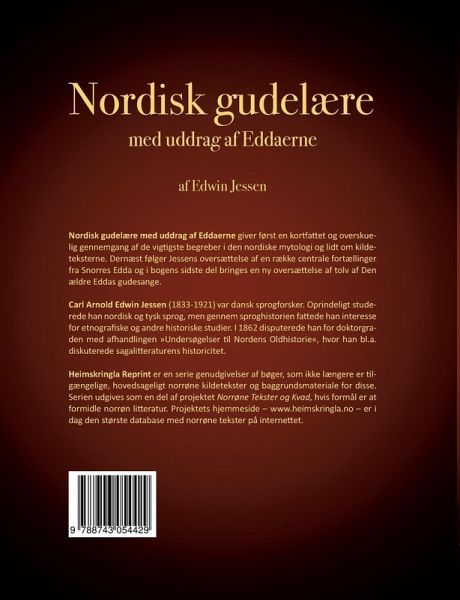 Nordisk gudelære med uddrag af Eddaerne giver først en kortfattet og overskuelig gennemgang af de vigtigste begreber i den nordiske mytologi og lidt om kildetek-sterne. Dernæst følger Jessens oversættelse af en række centrale fortællinger fra Snorres Edda og i bogens sidste del bringes en ny oversættelse af tolv af Den ældre Eddas gudesange.