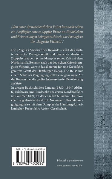 "Von einer dreiwöchentlichen Fahrt hat noch selten ein Ausflügler eine so üppige Ernte an Eindrücken und Erinnerungen heimgebracht wie wir Passagiere der 'Augusta Victoria'." Die "Augusta Victoria" der Rekorde - einst das größte deutsche Passagierschiff und der erste deutsche Doppelschrauben-Schnelldampfer seiner Zeit auf dem Nordatlantik. Benannt nach der deutschen Kaiserin Auguste Viktoria, war sie das allererste für eine Kreuzfahrt genutzte Schiff der Hamburger Hapag. Die Reise mit einem Schiff als Vergnügung stellte eine ganz neue Art des Reisens dar, die großes Interesse in der Bevölkerung auslöste. In diesem Buch schildert Landau (1850-1944) Abläufe, Erlebnisse und Eindrücke der ersten Nordlandfahrt im Sommer 1894, an der er selbst teilnahm. Drei Wochen lang dauerte die durch Norwegen führende Vergnügungsreise mit dem Dampfer der Hamburg-Amerikanischen Packetfahrt-Actien-Gesellschaft.