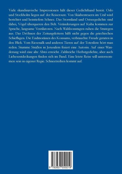 Viele skandinavische Impressionen hält dieser Gedichtband bereit. Oslo und Stockholm liegen auf der Reiseroute. Von Skiabenteuern im Ural wird berichtet und von tiefem Schnee. Das Stormland und Ostseegedichte sind dabei, Vögel überqueren den Belt. Veränderungen auf Kuba kommen zur Sprache, langsame Ventilatoren. Nach Wahlsonntagen ruhen die Strategen aus. Das Dröhnen der Zeitungslettern hilft nicht gegen die griechischen Schieflagen. Die Endmoränen des Konsums, verbrauchte Freude geraten in den Blick. Vom Riesenalk und anderen Tieren auf der Totenliste hört man reden. Stumme Straßen in Jerusalem fixiert eine Autorin. Auf einer Wanderung wird eine alte Abtei erreicht. Zahlreiche Herbstgedichte, aber auch Liebesentdeckungen finden sich im Band. Eine letzte Reise will unternommen sein in eigener Regie. Schneetreiben kommt auf.