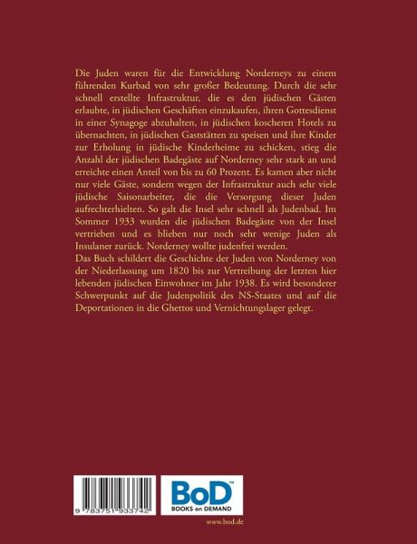 Die Juden waren für die Entwicklung Norderneys zu einem führenden Kurbad von sehr großer Bedeutung. Durch die sehr schnell erstellte Infrastruktur, die es den jüdischen Gästen erlaubte, in jüdischen Geschäften einzukaufen, ihren Gottesdienst in einer Synagoge abzuhalten, in jüdischen koscheren Hotels zu übernachten, in jüdischen Gaststätten zu speisen und ihre Kinder zur Erholung in jüdische Kinderheime zu schicken, stieg die Anzahl der jüdischen Badegäste auf Norderney sehr stark an und erreichte einen Anteil von bis zu 60 Prozent. Es kamen aber nicht nur viele Gäste, sondern wegen der Infrastruktur auch sehr viele jüdische Saisonarbeiter, die die Versorgung dieser Juden aufrechterhielten. So galt die Insel sehr schnell als Judenbad. Im Sommer 1933 wurden die jüdischen Badegäste von der Insel vertrieben und es blieben nur noch sehr wenige Juden als Insulaner zurück. Norderney wollte judenfrei werden.Das Buch schildert die Geschichte der Juden von Norderney von der Niederlassung um 1820 bis zur Vertreibung der letzten hier lebenden jüdischen Einwohner im Jahr 1938. Es wird besonderer Schwerpunkt auf die Judenpolitik des NS-Staates und auf die Deportationen in die Ghettos und Vernichtungslager gelegt.