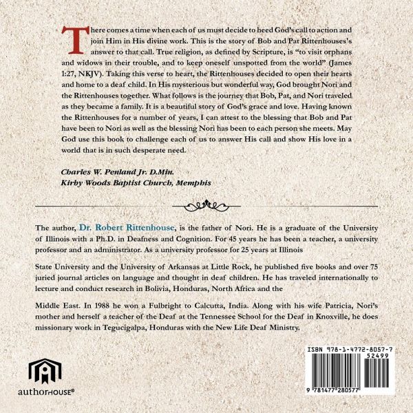 here comes a time when each of us must decide to heed God's call to action and join Him in His divine work. This is the story of Bob and Pat Rittenhouses's answer to that call. True religion, as defined by Scripture, is "to visit orphans and widows in their trouble, and to keep oneself unspotted from the world" (James 1:27, NKJV). Taking this verse to heart, the Rittenhouses decided to open their hearts and home to a deaf child. In His mysterious but wonderful way, God brought Nori and the Rittenhouses together. What follows is the journey that Bob, Pat, and Nori traveled as they became a family. It is a beautiful story of God's grace and love. Having known the Rittenhouses for a number of years, I can attest to the blessing that Bob and Pat have been to Nori as well as the blessing Nori has been to each person she meets. May God use this book to challenge each of us to answer His call and show His love in a world that is in such desperate need. Charles W. Penland Jr. D.Min. Kirby Woods Baptist Church, Memphis